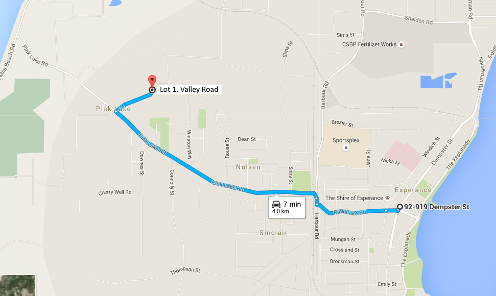 From the Esperance Post Office, drive up Andrew St (away from the foreshore). You'll drive past the Shell fuel station on your right. Keep driving along Andrew St, which becomes Pink Lake Road.